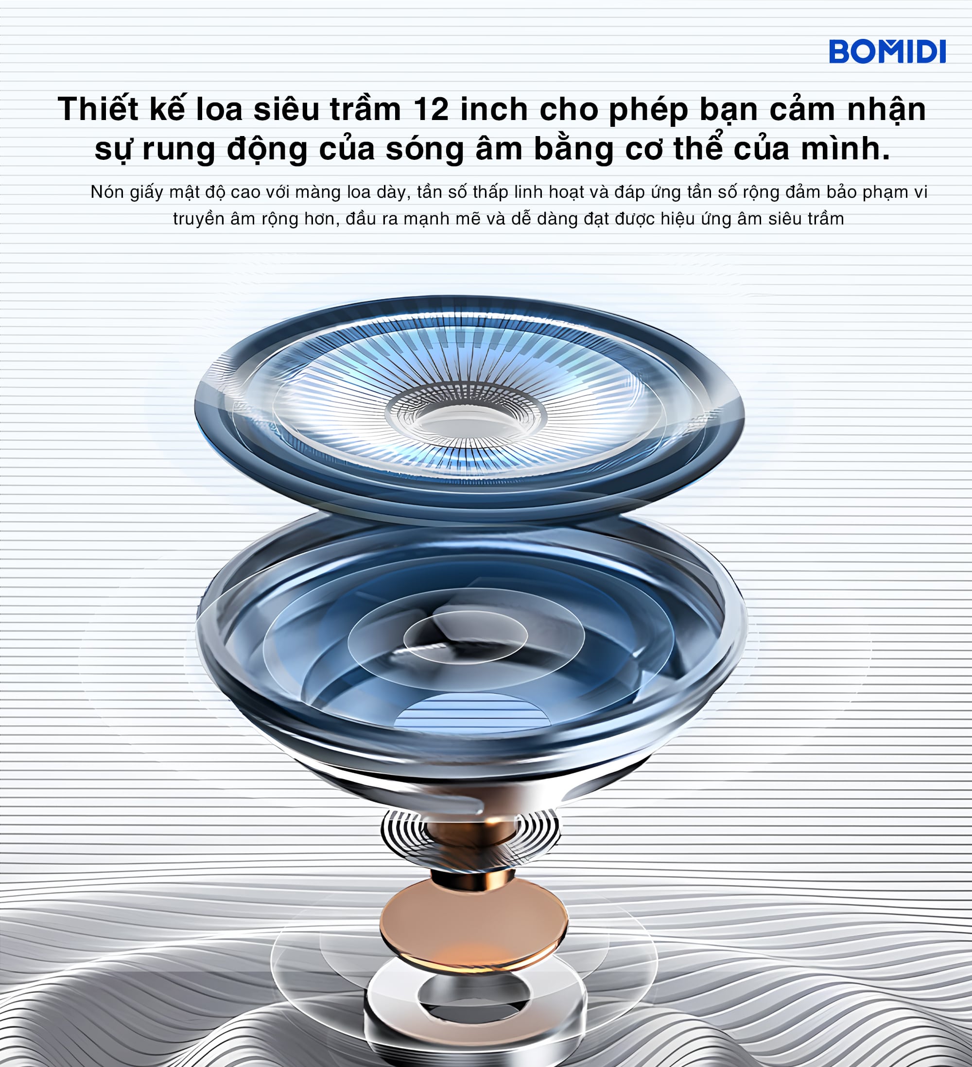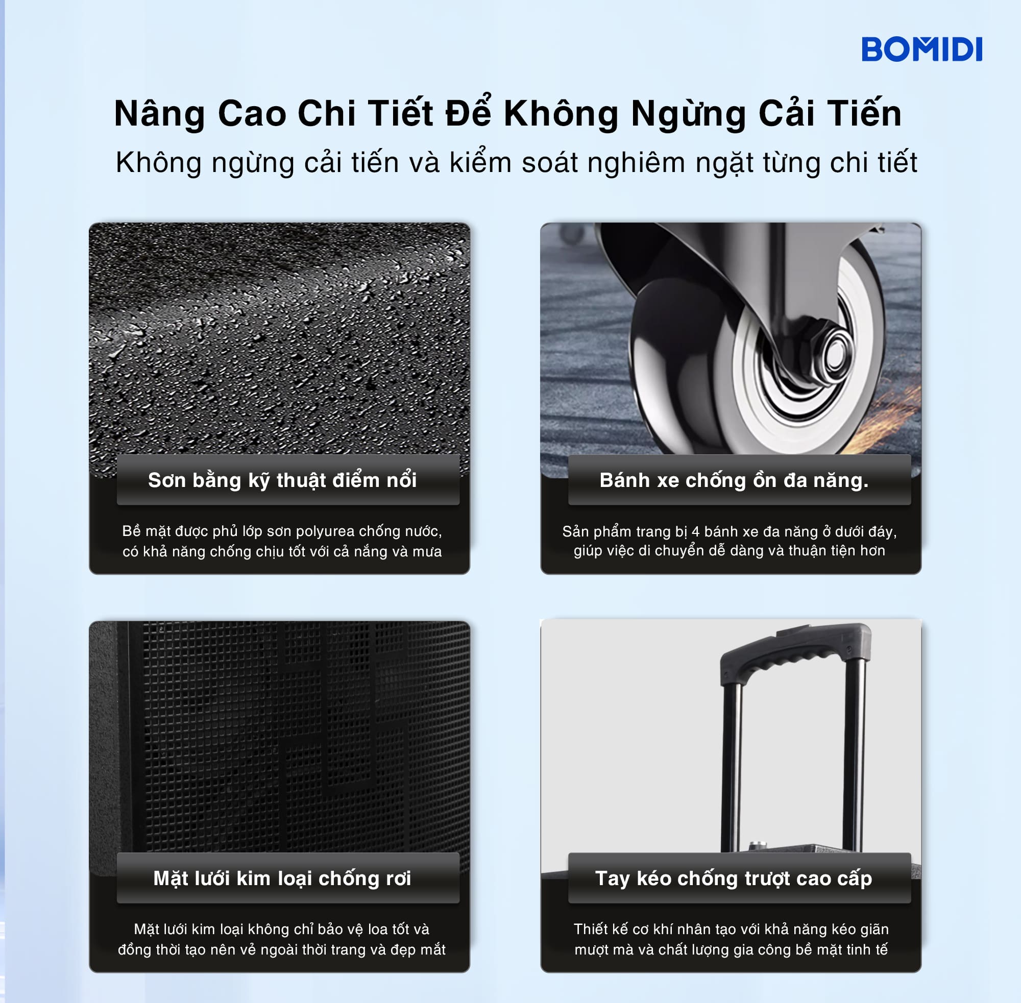 Loa kéo Bomidi TS01 nổi bật với hệ thống âm thanh mạnh mẽ, mang đến chất lượng âm thanh sống động và trung thực. Đây là sự lựa chọn lý tưởng cho những ai đam mê âm nhạc và thích trải nghiệm âm thanh chuyên nghiệp ngay tại nhà. Trang bị 3 loa Treble, Mid và Bass với 3 dải đường tiếng rõ rệt kết hợp với công nghệ âm thanh vòm giúp tái tạo âm thanh 360 độ, mang lại trải nghiệm âm thanh bao trùm và sống động như thật.. Kích thước của loa Bass lên đến 12 inch, cho hiệu ứng âm trầm mạnh và chắc khỏe. Công suất loa ấn tượng lên đến 500W đủ mạnh để phục vụ các buổi tiệc lớn mà vẫn giữ được độ rõ ràng của âm thanh. Bảng điều khiển chuyên nghiệp tích hợp nhiều chế độ âm thanh như Pop, Rock, Jazz, Classic,… cho phép người dùng dễ dàng tùy chỉnh âm thanh theo sở thích cá nhân.